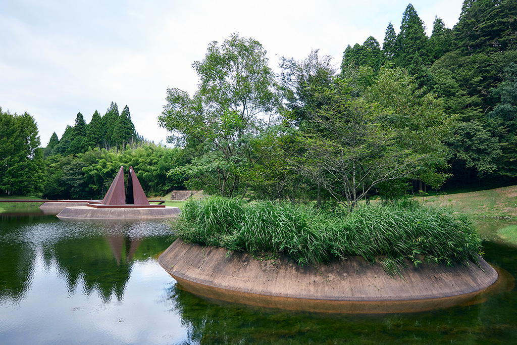 こちらはテントや家などの“保護された空間”をイメージした「ピラミッドの島」。モニュメントの素材はコールテン鋼といわれる鉄材を使用しています。表面は赤茶色に錆びていますが、それ以上は内側に進行しないため、耐久性は半永久的となります。