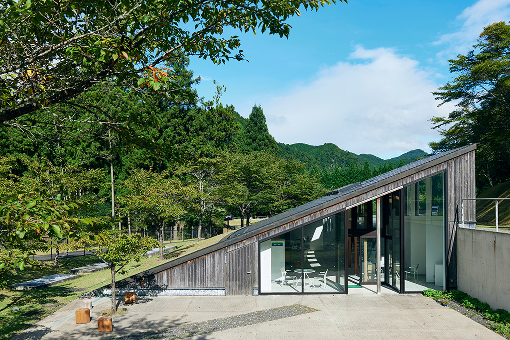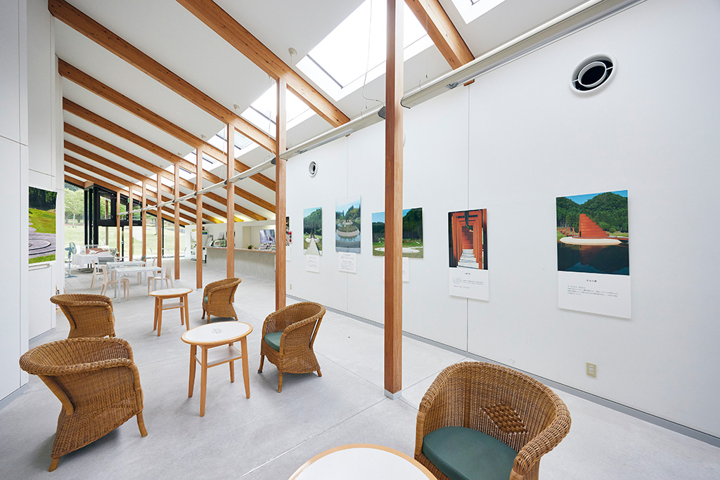 入口でもある「施設棟」は、休憩所として利用できます。また、施設内では、室生山上公園芸術の森にある作品について紹介しているコーナーもあるので、あらかじめ「施設棟」で予備知識を得てから園内を巡るとよりいっそう楽しめます。