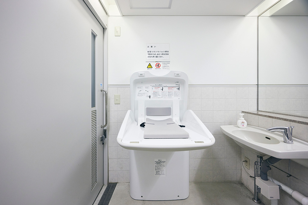 園内のトイレは、施設棟、南駐車場付近の2カ所あります。施設棟にあるトイレにはおむつ交換台が設置されています。野外で展示している作品の付近にはトイレがないので、前もって済ませておきましょう。