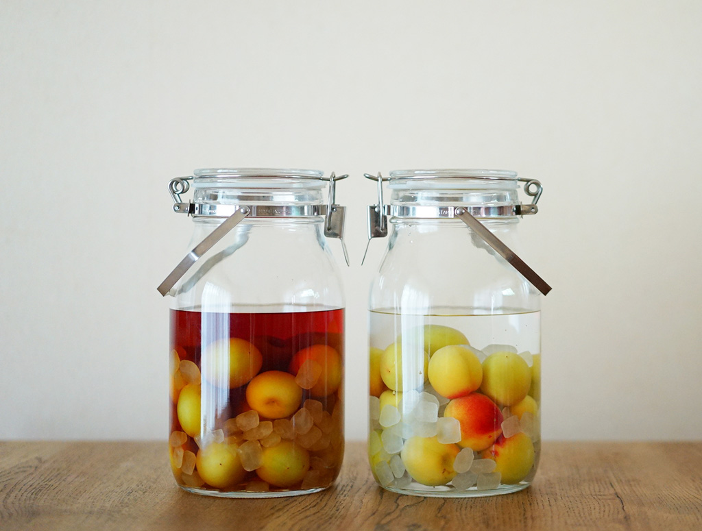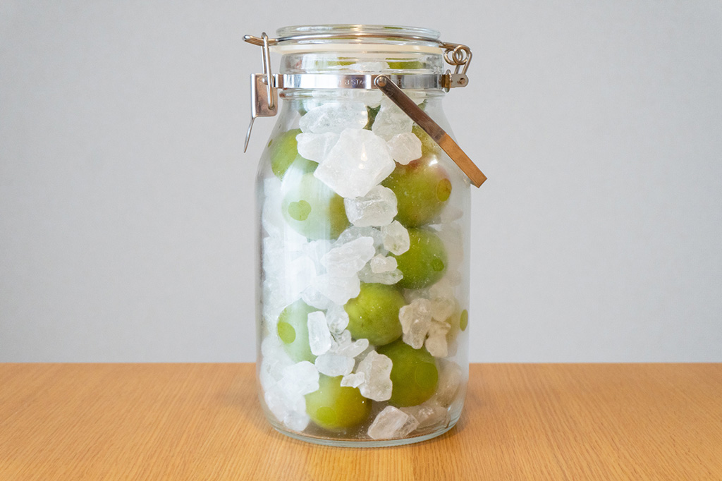 梅酒は、梅シロップの作り方と基本的に同じです。材料の分量の目安は、青梅1kgに対し、氷砂糖500g、ホワイトリカー1.8リットル。青梅と氷砂糖を交互に入れたあと、最後にホワイトリカーをいれ、なじませます。アルコール35度以上のホワイトリカーが一般的ですが、日本酒やブランデーで漬けるのも◎。自家製梅酒ができると、夏の晩酌の楽しみが増えますね。