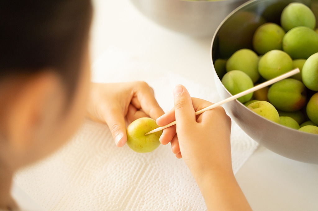 【2】青梅を洗い、水気をしっかりと拭いたら、梅のヘタを竹串でとります。ひとつひとつていねいに、親子で楽しく会話もはずみます。