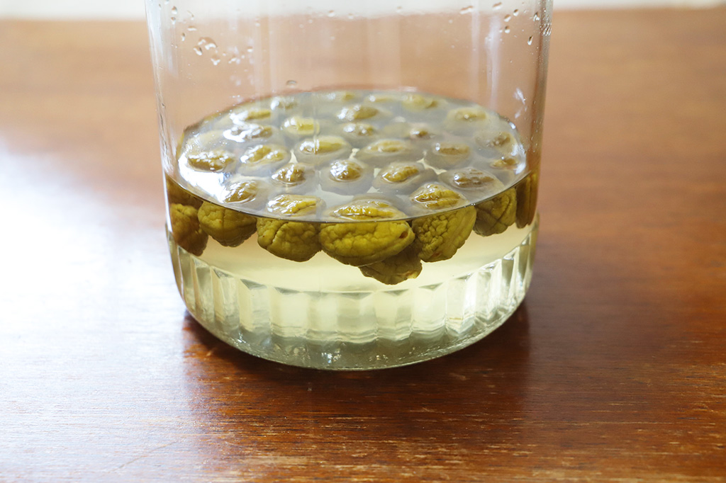【5】1週間~10日ぐらいで梅の色が少しずつ変わり、シロップがあがってきます。2~3週間後、すべての梅がしわしわになり、氷砂糖が溶けたら、完成です。梅シロップがほのかに色をついた状態になったら、梅の実を取り出し、シロップだけにして保存をしましょう。あまり長い期間、梅を漬けすぎると、渋みがでてしまうことがあるので注意を。