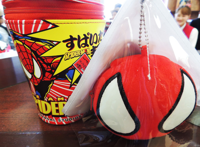 アトラクションの隣にある「ユニバーサル・スタジオ・スーベニア」では記念グッズを販売。左は、すぱいだぁ麺!!ポーチ 2900円、右は、スパイダーまんポーチ 2500円