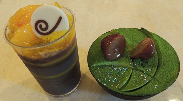 左は、紳士サンジのビターチョコ・パルフェ ~オレンジ&パッションフルーツ~ 900円。右は、剣士ゾロの抹茶菓子 ~黒蜜&わらび餅~ 900円