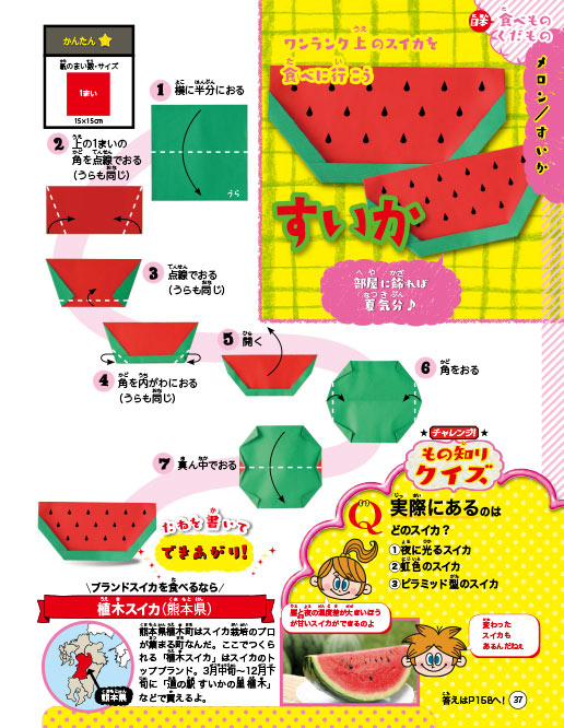 夏の風物詩といえばスイカが定番です。『るるぶ 楽しく折って親子で世界一周!旅のおりがみ100』では、季節の折り紙レシピとしてスイカの折り方が詳しく紹介されています。赤い折り紙と緑の折り紙を使って、リアルなスイカを表現できます。