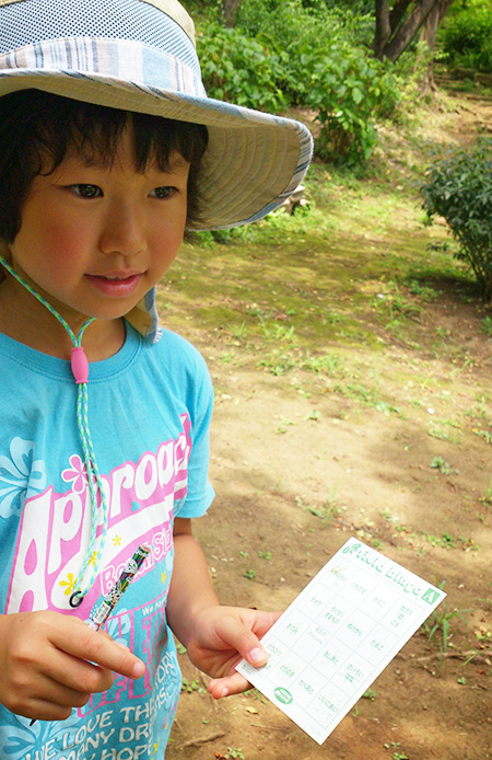 ビンゴに書かれたものを探して、「こんなものがあったよ」と楽しみながら歩いているうちに、子どもも自分はどこにいるのかな、ここにはこんな木があるんだな、ということがわかってきます。