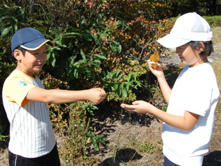 - また1対1でジャンケンをして勝ったら、次は違う形、色の落ち葉を拾う。これをくり返し、拾った落ち葉をみんなで見せ合う。