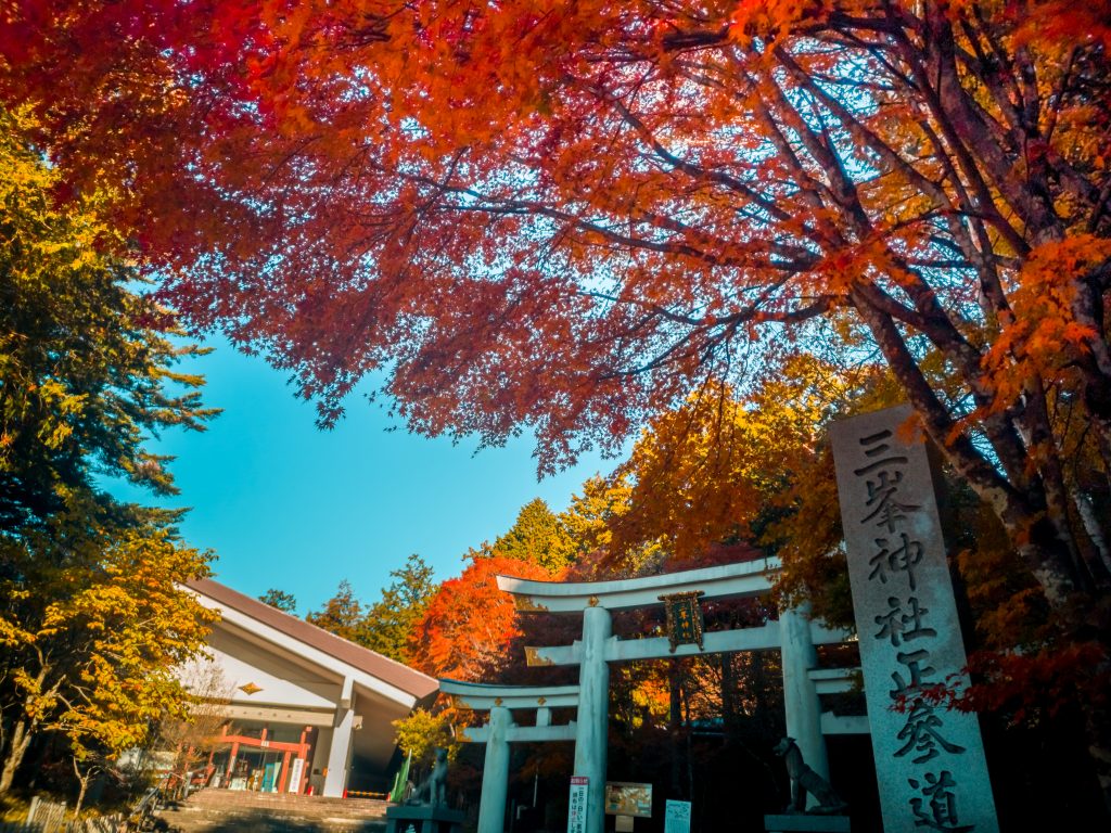 紅葉に飾られたこちらの鳥居は、全国的にも珍しい“三ツ鳥居”。厳かな気持ちで鳥居をくぐり、境内を歩き始めましょう。