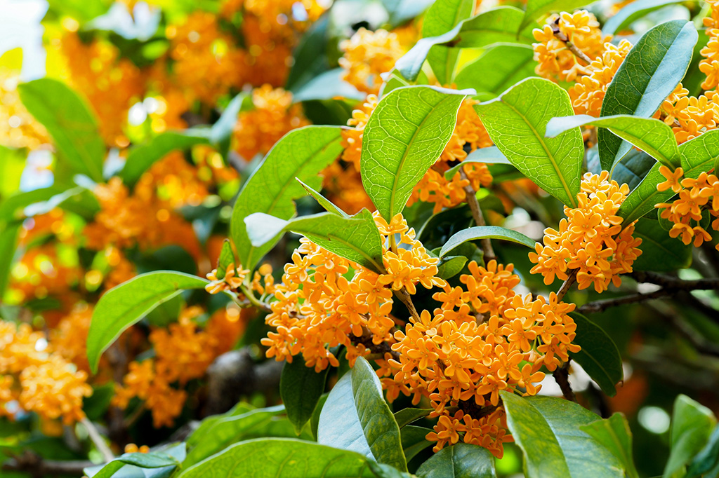 金木犀は涼しくなってきた9月下旬から10月中旬に橙色の小さな花を咲かせ、やさしく甘い香りを放ちます。高さは4mぐらいになり、日本では庭木や街路樹として古くから好まれているため、季節になれば街のあちこちで金木犀の香りを感じることができるでしょう。