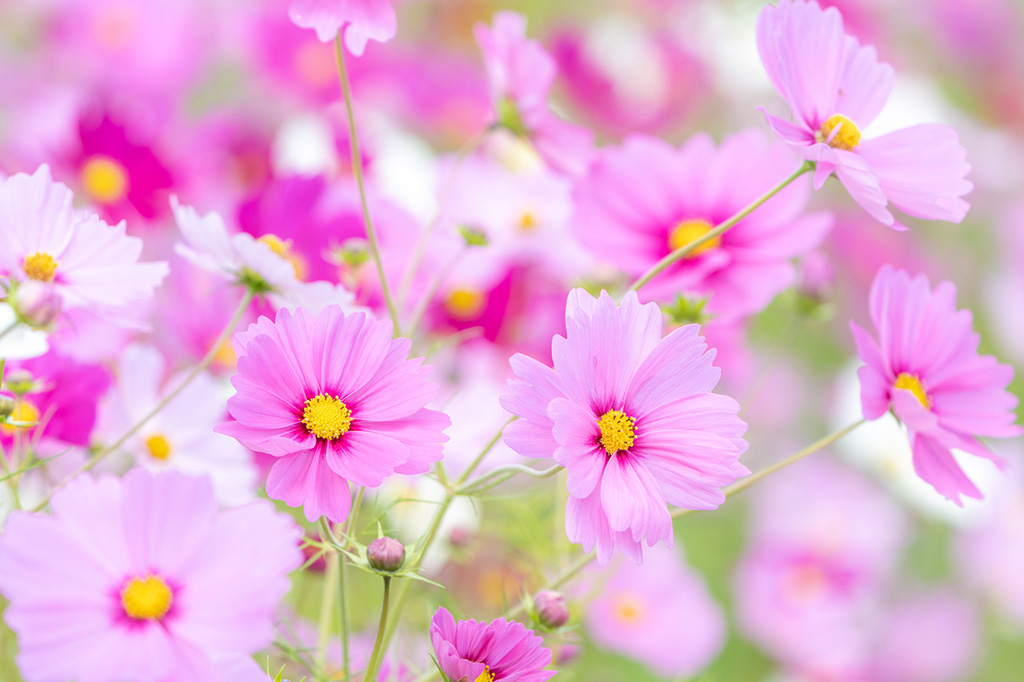 秋を代表する花のひとつが、コスモス。漢字で「秋桜」と書くように、ピンクの花びらのイメージが強いかもしれませんが、白、赤、黄、オレンジなど品種により、花色はさまざま。丈夫で育ちやすい植物なので、この時期には街のいたるところで見ることができます。