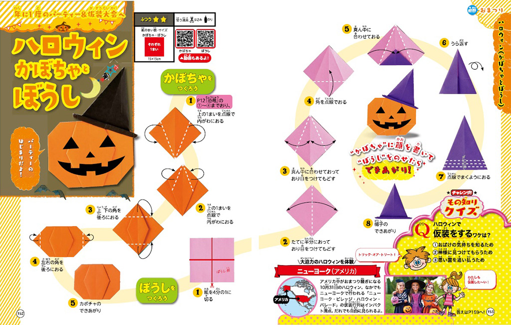 たくさんの折紙レシピが載っている『るるぶ 楽しく折って親子で世界一周!旅のおりがみ100』の中から、10月は「ハロウィンのかぼちゃとぼうし」をご紹介。ハロウィンの飾り付けを、折り紙で簡単に作ることができます。