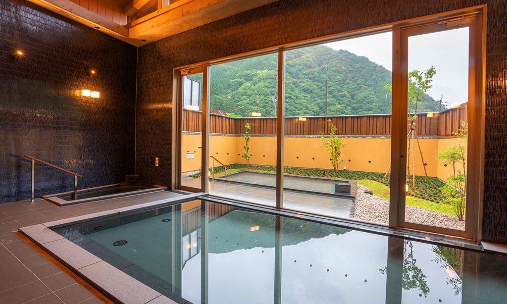 中芸地域には、旅の疲れを癒やす立ち寄り温泉が数多くあります。構成文化財の旧魚梁瀬森林鉄道小島橋の近くにある「北川村温泉ゆずの宿」は、美肌の湯としても親しまれ、四季折々の美しい景色を眺めながら源泉100%のとろとろのお湯で疲れを癒やすことができます。