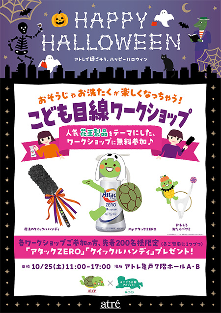 花王こども目線プロジェクトとコラボしたハロウィンイベント「こども目線ワークショップ」では、人気の製品をテーマにした5種類のワークショップを通して、“おそうじ”や“お洗たく”といった家事の世界を、子どもの自由な発想と楽しさに変える体験ができます。参加した子どもにはプレゼントも!また、仮装したカメレちゃんと一緒に館内を練り歩く「ハロウィンパレード」も開催。仮装や、ワークショップで作ったアイテムを持って参加しよう!参加者にはお菓子をプレゼント!