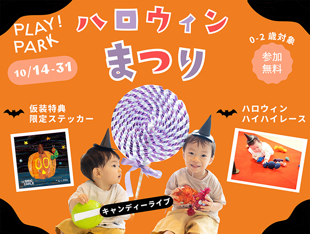 子どもが自由な発想で遊べる屋内キッズパークでへんてこなハロウィンを満喫!0~2歳の子どもとそのご家族を対象に、親子で楽しむ「キャンディーライブ」や「ハイハイレース」を開催。仮装して来場した0~12歳の子どもとその保護者には「ハロウィン限定ステッカー」をプレゼント!