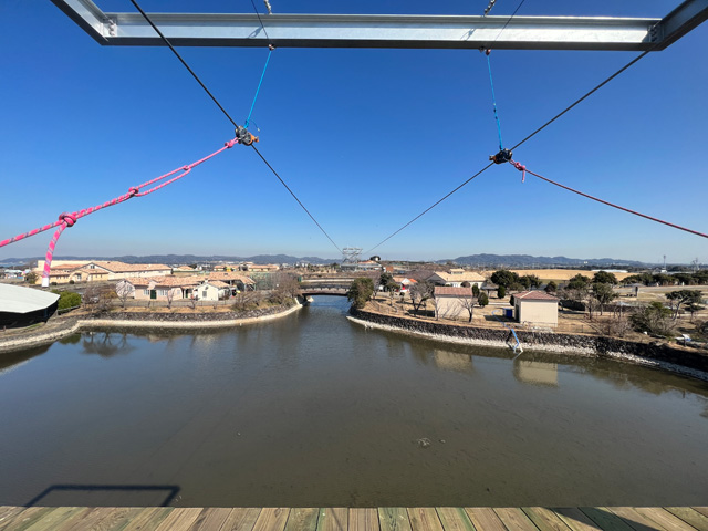 - ジップラインあり/1本/往復360mあるケーブルに金具(プーリー)を掛けて池の上などを滑走する「ロングジップスライド」/身長110cm以上、体重100kg以下、小学校 2 年生以下は保護者参加(保護者有料)