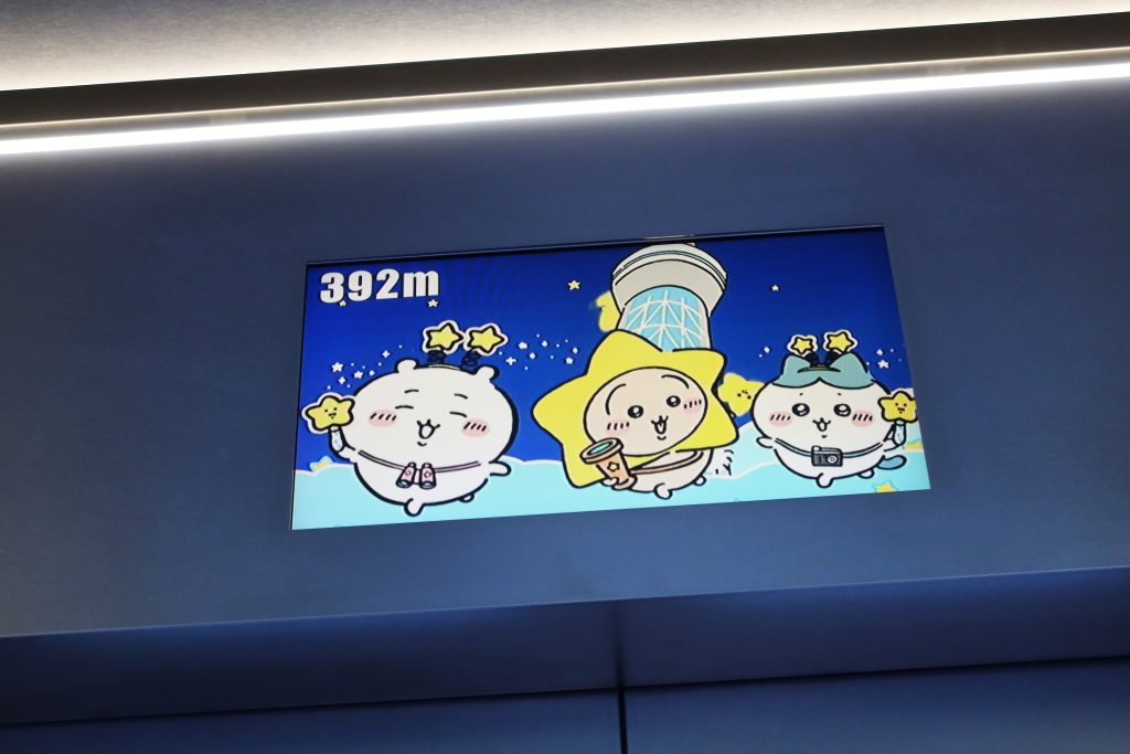 天望デッキから天望回廊に向かうエレベーター内には、イラストを使用した装飾が。高さを表示するモニターもイベント仕様なのでお見逃しなく!