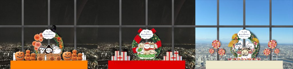 また、天望デッキフロア350にもイベントオリジナルのちいかわ達がいるのでお楽しみに!こちらはシーズンごとのフォトスポットで、ハロウィン(10月末まで)、クリスマス、お正月でフォトスポットのデザインが変わります。