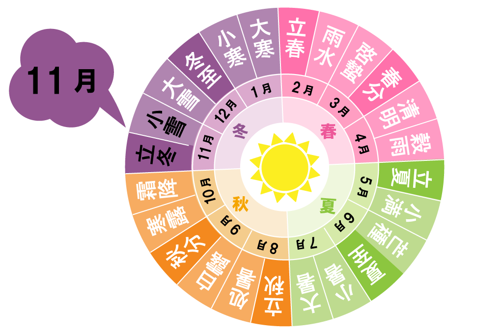 二十四節気(にじゅうしせっき)とは、季節を表す24の言葉で構成されたもの。11月は冬の始まりを告げ、厳しい寒さを意味する立冬、小雪の2つとなっています。