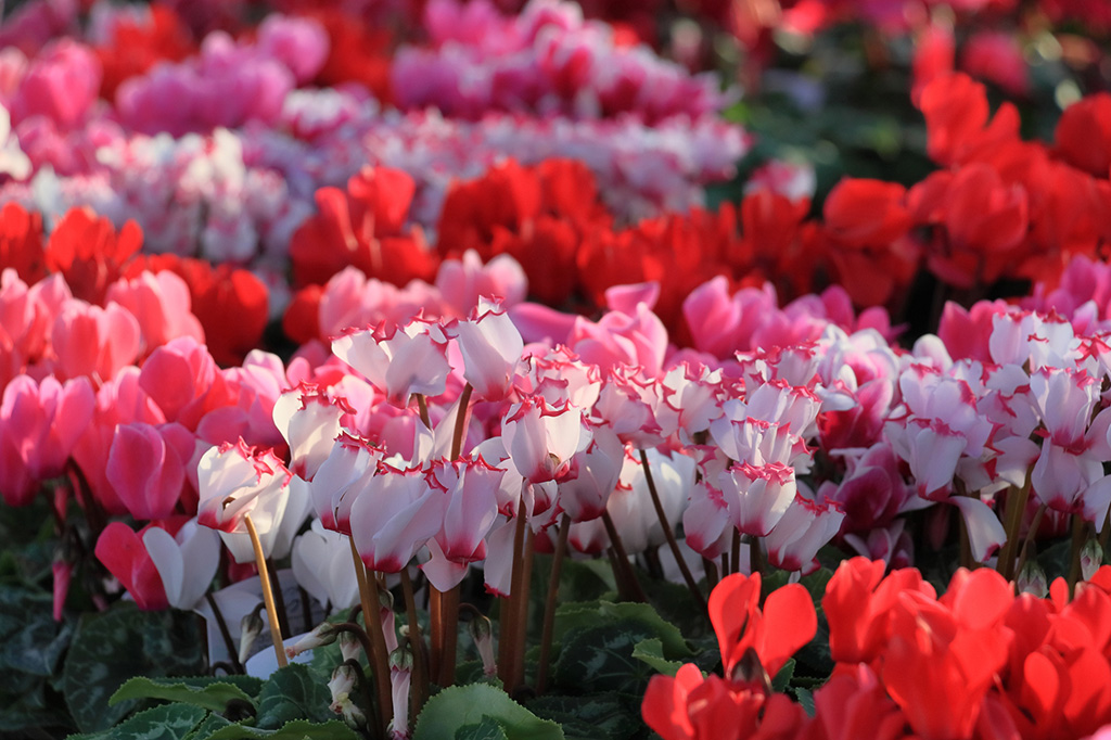 シクラメンは赤、白、ピンク、紫など色とりどりの花を咲かせます。花が下を向いて咲くのが特徴で、まるでうつむいているように見えます。「豚の饅頭」という面白い名前がついた理由は、シクラメンの球根を豚が好んで食べることからきています。
