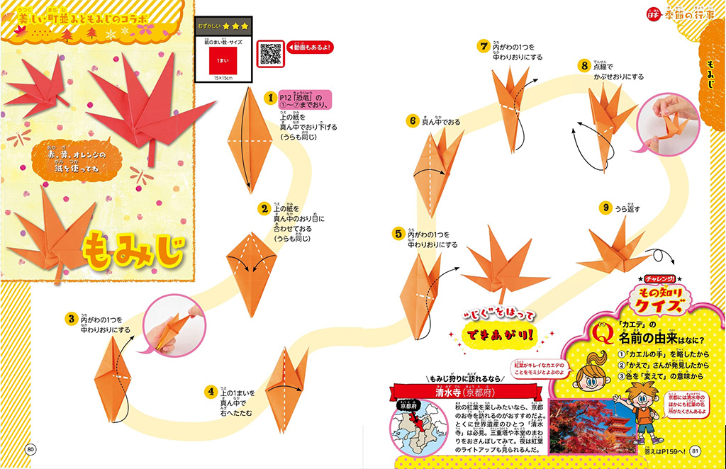 たくさんの折紙レシピが載っている『るるぶ 楽しく折って親子で世界一周!旅のおりがみ100』の中から、11月は「もみじ」を紹介。