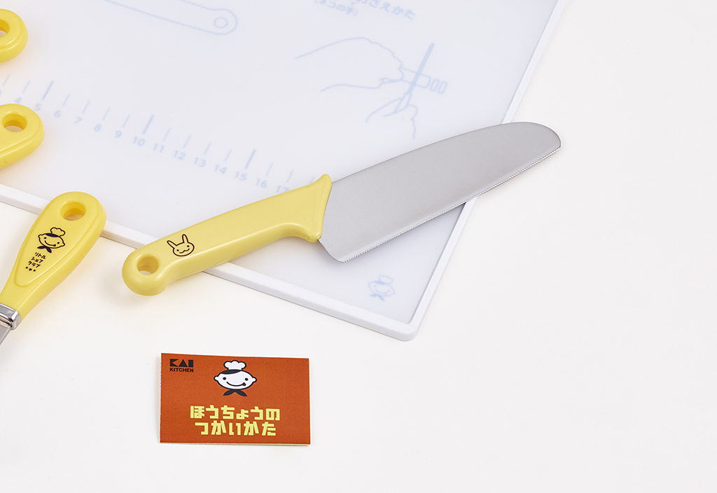 切り方のコツが描かれたまな板と、ギザ刃の包丁。はじめての調理体験でもばっちりです。