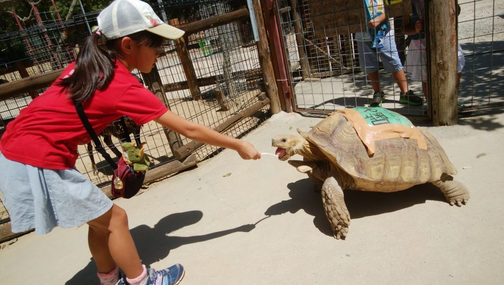 動物たちとの距離が近いことが、しろとり動物園の特徴です。ただ距離が近いだけではなく、猛獣以外はほとんど自由になでたりエサをあげたりできるところがポイント。エサをあげるのにちょっと尻込みしてしまうという子供なら、「なかよしminiサファリ」に行ってみましょう。リクガメやサル、シカ、アルマジロといった動物たちのいるケージに入り、ふれ合うことができます。おとなしい動物が多いので、エサをあげるのも難しくなさそう。