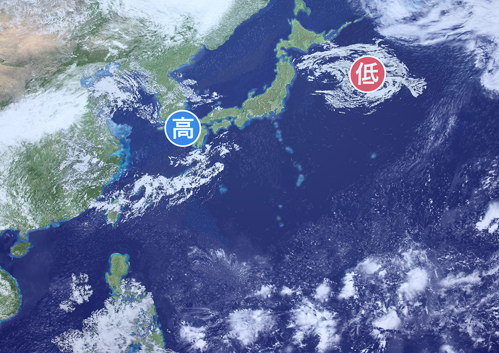 木枯らしは、先ほども述べたように「西高東低の冬型の気圧配置」のときに吹きます。これは、文字の通り西にある大陸に高気圧が、東の海の上に低気圧がある状態です。秋が深まると、北半球を照らす太陽の光が弱くなり、気温が下がっていきます。このとき、陸のほうが海よりも冷えやすいため、大陸のほうが冷たくなり、地面の上の空気が冷やされます。逆に、海の上の空気は陸の上よりも暖かくなります。