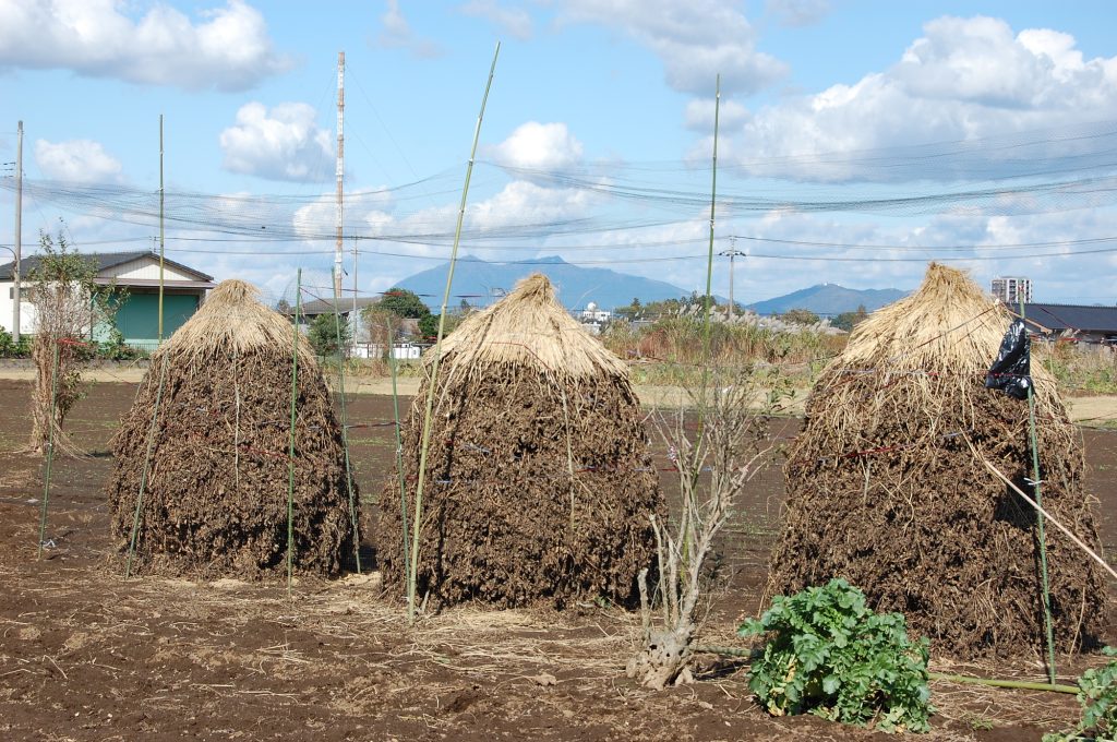1~2カ月かけてゆっくり乾燥。すると、甘みが増しておいしくなるのです。畑にぼっちが点々と並ぶ光景は、千葉県の秋冬の風物詩。生産地に行けば、どこでも見られるはずですよ。