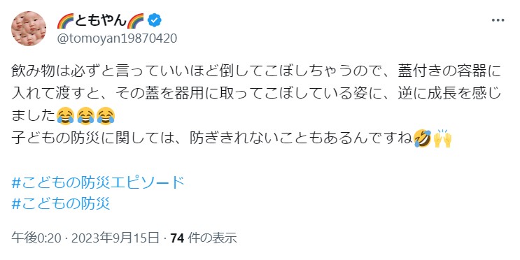 2023年9月1日(金)から15日(金)まで「るるぶKids」公式Xにて募集していた『#こどもの防災エピソード 大募集キャンペーン』の入選者エピソードを発表します!今回は、子育て漫画で大人気のこげのまさきさん(@koge_diary)に描いていただきました。
