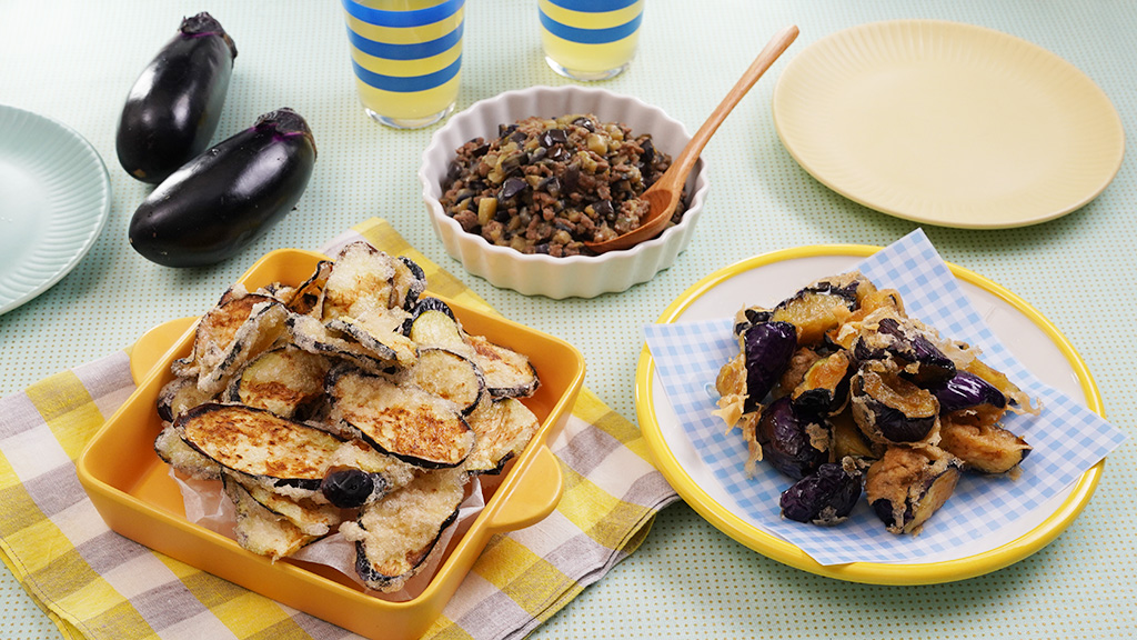 ご飯のお供にぴったりの肉味噌や、なすと相性のいい油で揚げたチップス&唐揚げ。これなら、なすに苦手意識を持つ子も喜んで食べてくれそうです。さっそく試してみては?