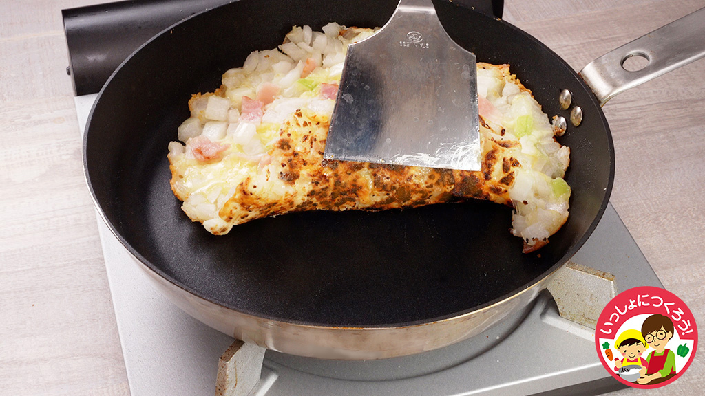 フライパンいっぱいに大きく広げると裏返しにくいという場合は、小さいサイズで作ってみて。なるべく薄く、パリパリに焼く方がおいしいですよ。子どももひっくり返しやすいサイズにすると、一緒にできて楽しい時間に♪