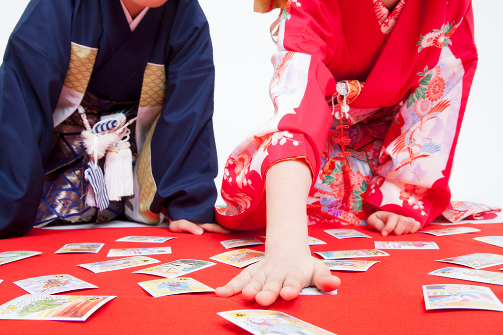 かるたは、読み札と絵札に分けられた2種類の札を使って、読み上げられた札を競って取るゲーム。いろは歌を用いた「いろはかるた」は、子どもが遊びながら字やことわざを学べるように江戸時代後期に考案されたそうです。「百人一首」もかるたの一種で、鎌倉時代に藤原定家が選定した歌集「小倉百人一首」から作られています。本来、宮中の遊びだった、この「百人一首」が江戸時代、庶民に広がり、お正月に遊ばれるようになりました。