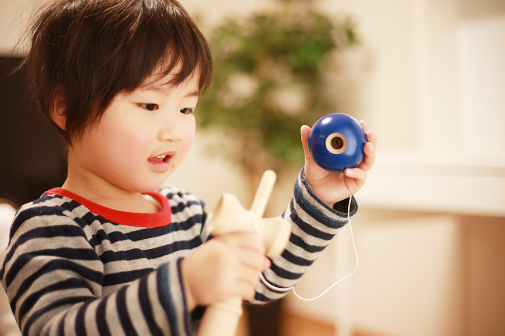 けん玉は、立って遊ぶ全身運動。手先だけでなく、全身をつかって力加減を調整したり、リズムよくひざを屈伸させたりするのが上達のポイントです。室内で簡単にできるのも良いですね。ぜひ親子で競って遊んでみましょう。集中力を高める効果もありますよ