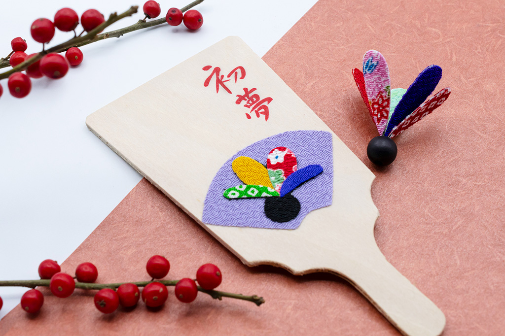 羽根つきも、凧揚げ同様、外で楽しく体を動かせるお正月遊びのひとつ。一年の厄をはねのけ、子どもの成長の願うものとして、古くからお正月に行われています。羽を落とした人は、顔に墨を塗る罰ゲームがありますが、これは実は厄除けのおまじないなんですよ。羽子板を持った二人が向きあって、羽を付き合うのは「追羽根(おいばね)」と呼び、一人で何回、羽を突けるかに挑戦する「揚羽根(あげはね)」という遊び方もあります。