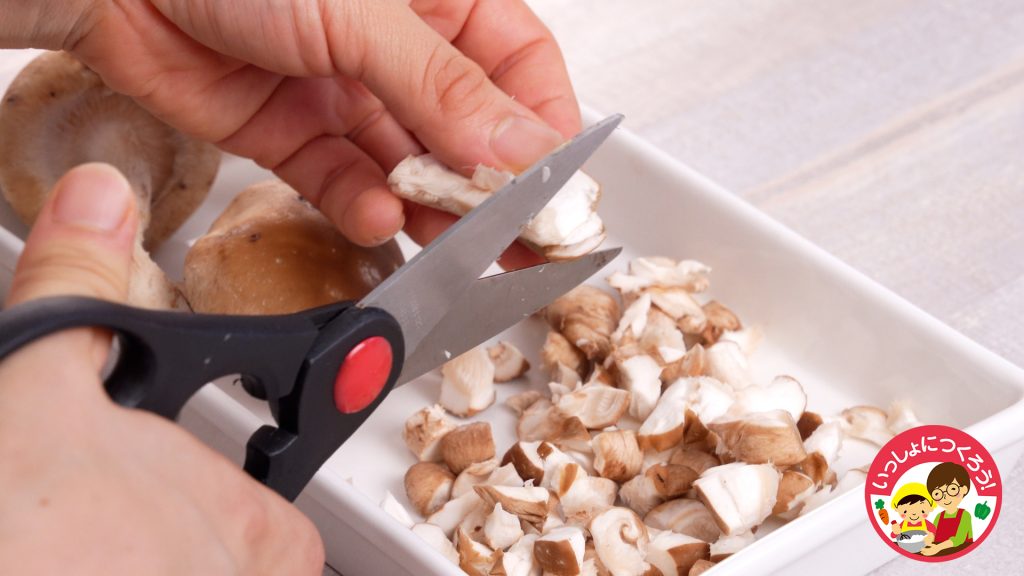 ① しいたけは石づきをハサミでカットし、軸と傘を分ける。それぞれ5mm角になるようにカットする。