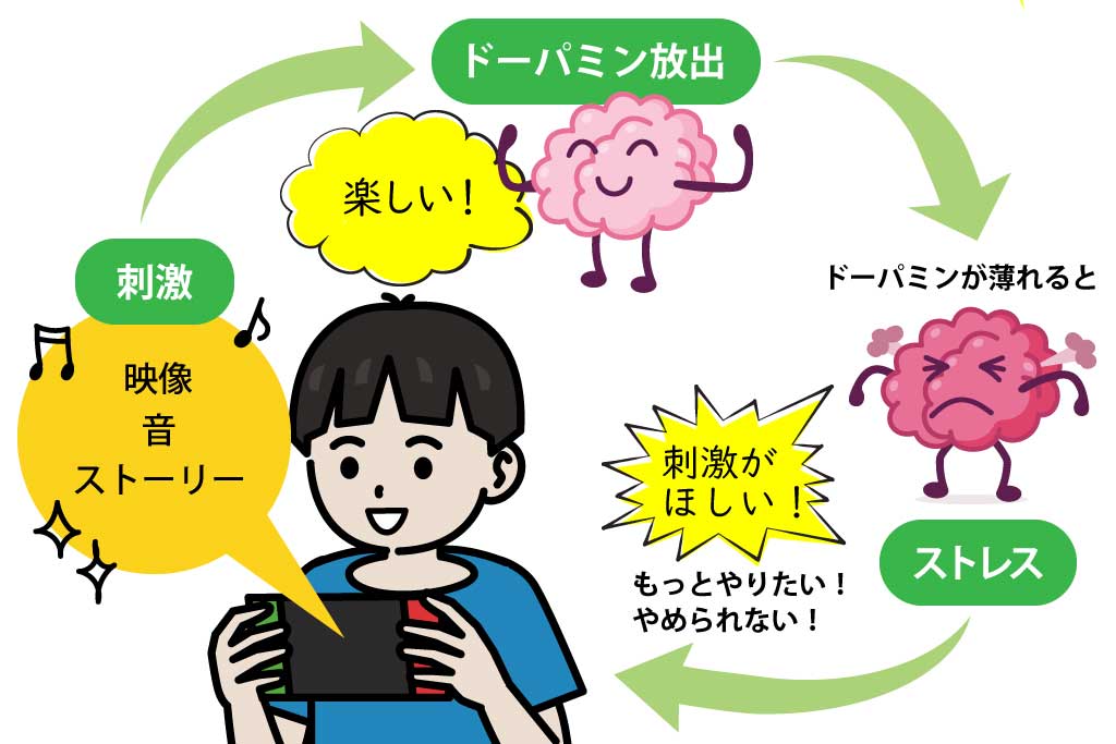 『楽しい、嬉しい』などの感情が湧くと、脳の扁桃体から神経伝達物質のドーパミンが放出されます。ドーパミンは、幸福感をもたらしてくれる脳内ホルモンのひとつ。特にゲームは、音や映像、ストーリーが多重に脳を刺激するため、『楽しい』という気持ちが湧きやすく、どんどんドーパミンが放出されていきます。「なかなかやめられない」という状況になるのは、ゲームが持つ優れたエンタメ性と、このドーパミンによるもの。大人でも子どもでも同じですが、特に脳の発達が未熟な子どもは自主的にやめることが難しく、行動依存になりやすい一面をもっているのです。