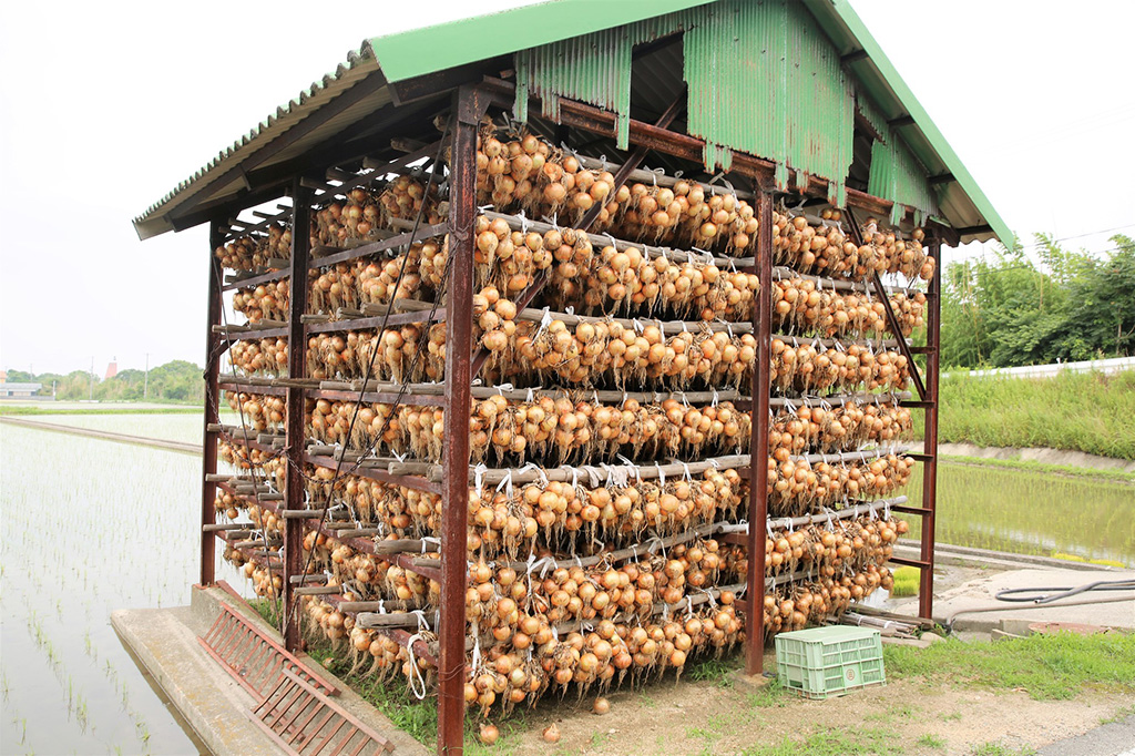 そして、初夏になるとお目見えする「タマネギ小屋」は、収穫後に見られる淡路島の風物詩の一つ。これもタマネギをおいしくする知恵なのです。葉を結び、風通しのよい場所で太陽の光に当てて貯蔵することで、葉の養分が球に下りて、より一層甘くなるうえ、皮の色もさらに輝いてくるそうです。