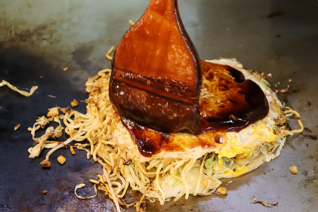 広島風のお好み焼きは、生地を鉄板の上に薄く広げ、キャベツなどたくさんの具材を積み上げ、ひっくり返す「重ね焼き」スタイルがメイン。具材に麺が入るのも大きな特徴です。
