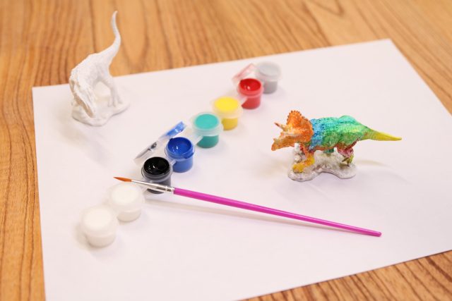 2010年に発掘されたアンキオルニスの化石からほぼ全身の色が判明したことから、恐竜は実は色鮮やかだったのでは?という研究が進んでいます。まだ明らかになっていない恐竜の皮膚の色を考えて、絵の具で塗って再現してみましょう!塗ったフィギュアはお持ち帰りできます。