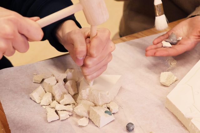 化石発掘の中で一番大切な工程である「化石クリーニング」。ハンマーやはけを使って、ていねいに、ときには大胆に!?石の固まりを砕いてみましょう。実際の現場に限りなく近い形で体験をおこなうので臨場感抜群。何が発掘されるかはお楽しみに!