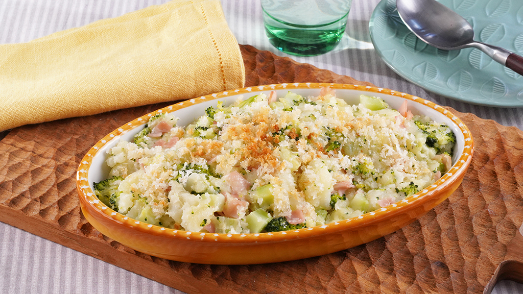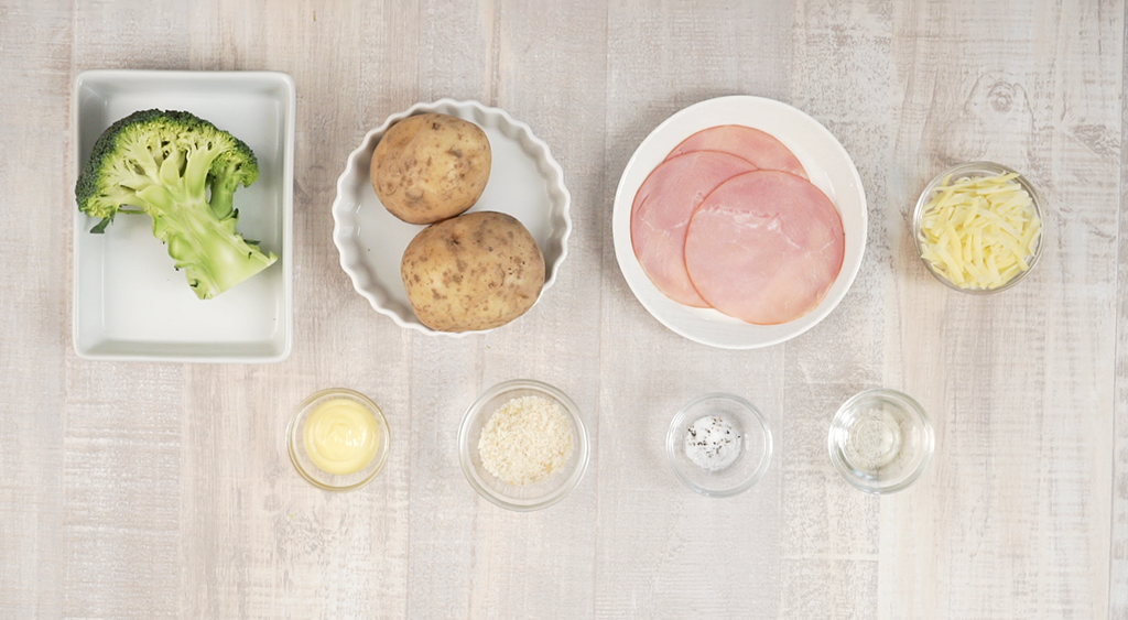 ① ブロッコリーは房に分け、茎は皮をむいて1cm角にカットする。じゃがいもは皮をむいてひと口大に、ハムは1cm角にカットする。