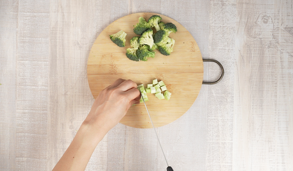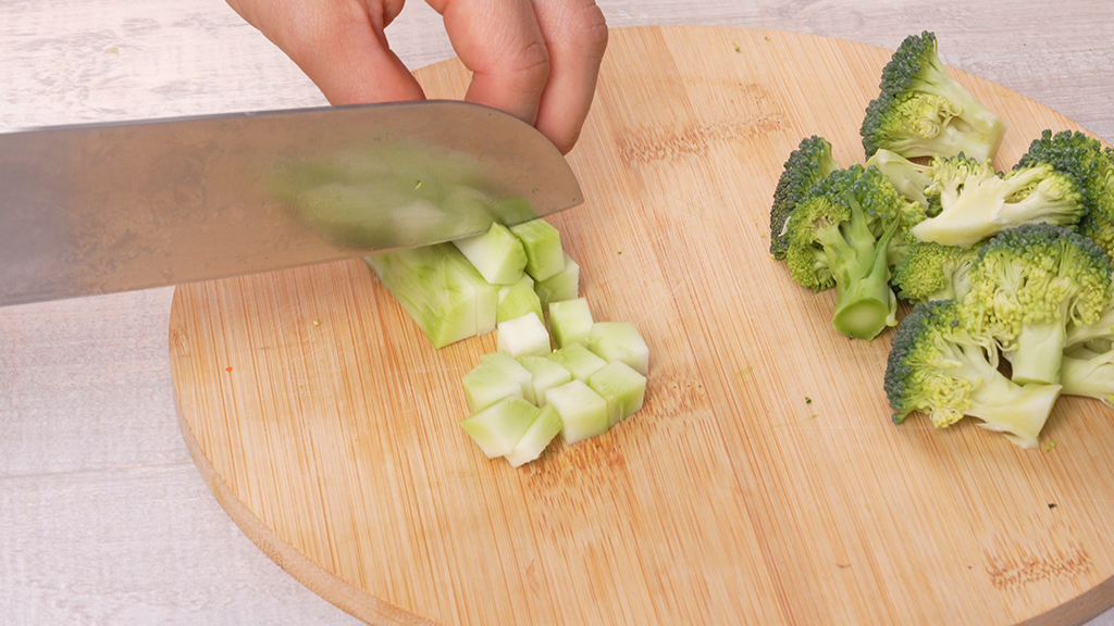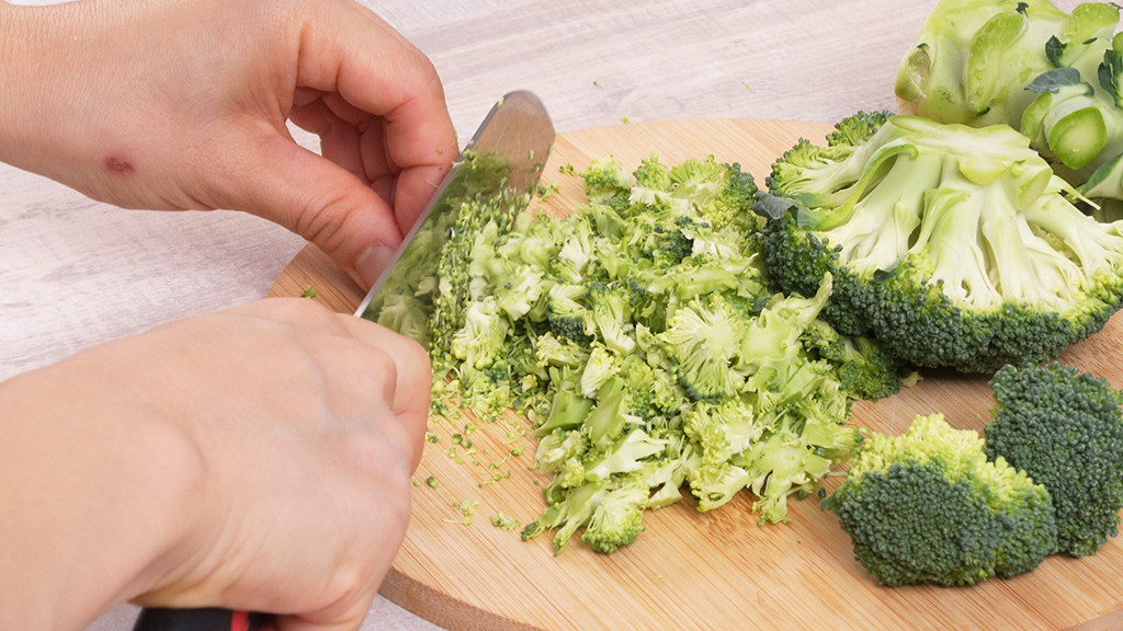 ① ブロッコリーの穂先をそぎ落とし、細かくカットし、茎は皮をむいてみじん切りにする。