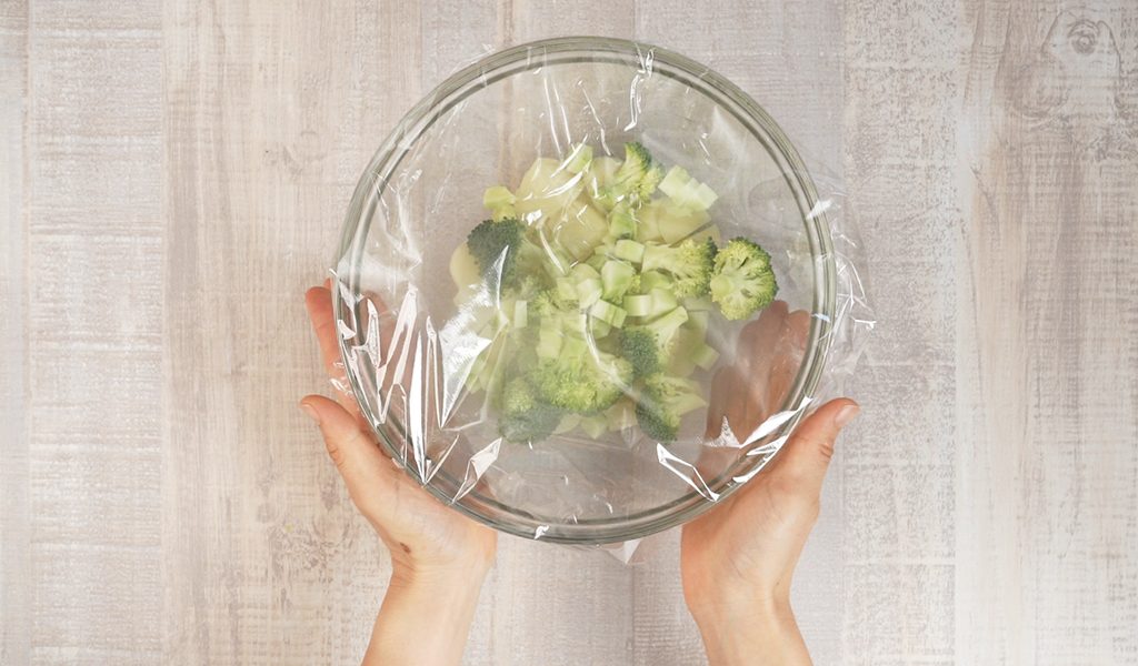 ② 耐熱ボウルに①のじゃがいもを入れてラップをかけ、電子レンジで500w5分加熱する。同じボウルに①のブロッコリーを入れて、さらに3分加熱する。