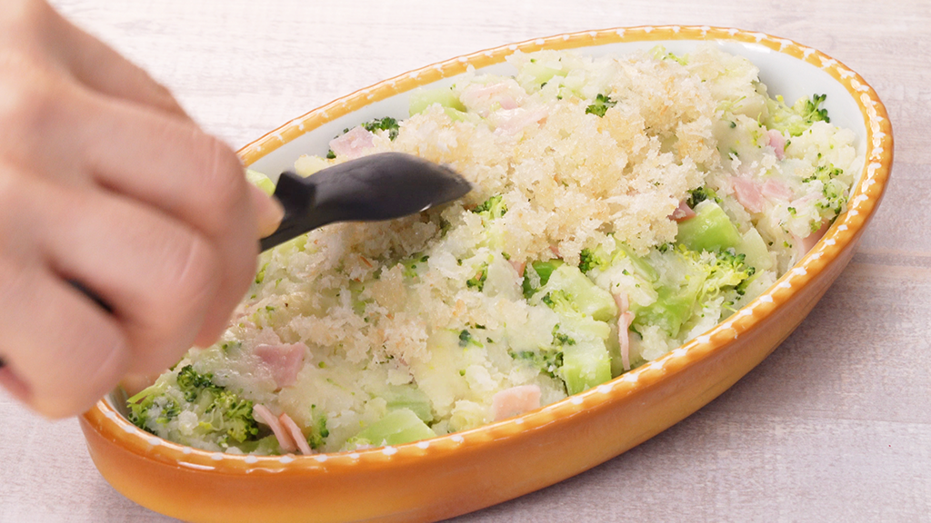 ④ 耐熱皿に③を引いて、パン粉と米油を混ぜたものをのせる。トースターでパン粉の焦げ目がつくまで焼いて完成。