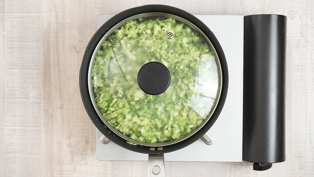 ③ ふたを取り、にんにくと塩を入れてさらに混ぜ、ブロッコリーがしんなりしたら完成。