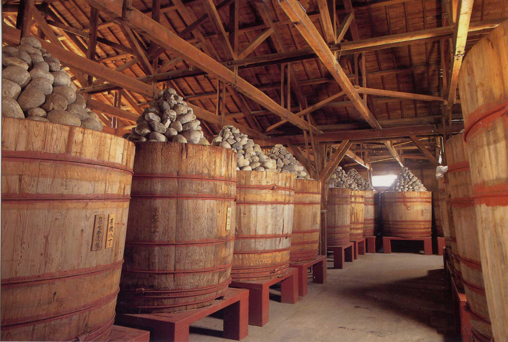 八丁味噌の醸造蔵の名物は、木桶で味噌を熟成させる際の「石積み」です。八丁味噌は、ほかの豆味噌よりも仕込み水が少ないことから、より多くの重石(おもし)が必要。「カクキュー」の場合、1本の木桶に八丁味噌を約6t仕込み、その上に約3t、数にしてなんと約350個もの重石を積み上げます。