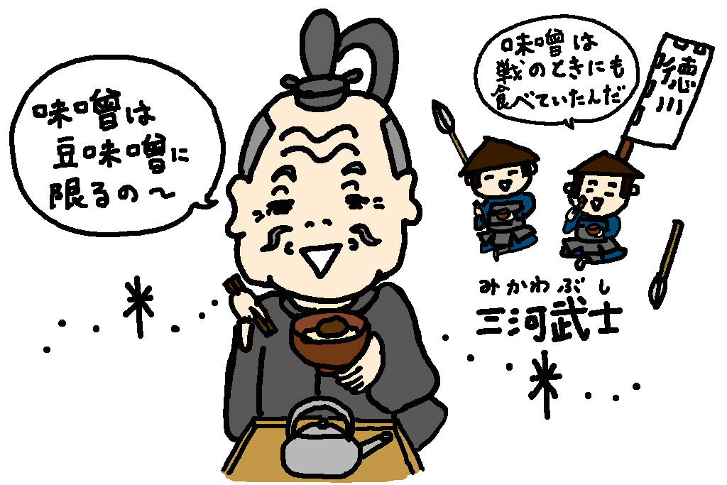 家康に仕えていた三河武士も、陣中食(戦国時代の戦いの場で食べられた保存食)として豆味噌を重宝。例えば、イモのつるを味噌に漬けておいたものを、戦いの際に切ってお湯に入れて、現代のインスタント味噌汁風に食べていたようです。