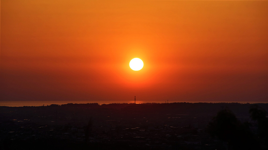 夕焼けの空は、空気中の水蒸気の量によって色合いが変わってきます。水蒸気の量が多いほど、赤色が濃くなります。これは、空気中の水蒸気量が多いと波長の短い青色の光が強く散乱されて減ってしまうため、私たちの目により赤色の光が届きやすくなるためです。