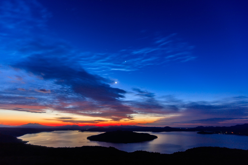日没後、夜の空に移り変わる短い間で見られる濃い紺色の空。いわゆるブルーモーメントと呼ばれる空です。