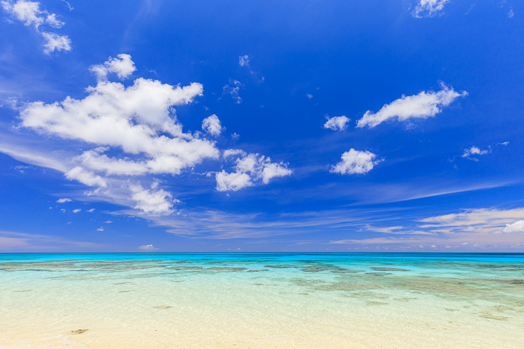 深く濃い青色。真夏の空のような、白い雲とのコントラストの強さが目立つ空の色です。
